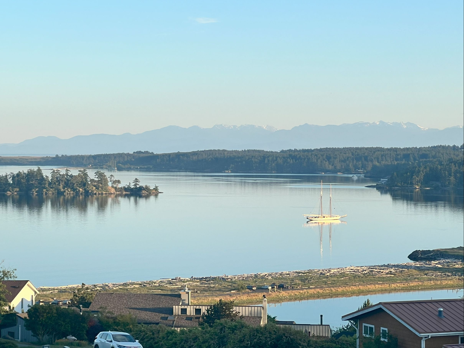 Southern-facing, hilltop home overlooking Griffin Bay, Dinner Island, Jackson Beach, and the Olympic mountains.Â
